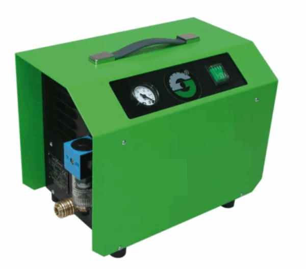 Kompakte Vakuumpumpe mit 2,5 l Tank und pulverbeschichtetem Gehäuse.