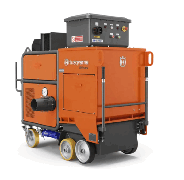 Das robuste Staubabsaugsystem Blastrac DC 350EX wurde speziell für die Stahlstrahlmaschine Husqvarna Blastrac EBE 350EX entwickelt. Zu diesem Staubabscheider gehört eine elektrische Vorrichtung für die Strahlreinigung von Lagertanks und Ölplattformen. Blastrac DC 350EX ist mit einer gemäß Ex II 2G Ex db IIB+H2 T5 Gb (IP66) explosionsgeschützten Bedientafel und funkenfreien Elektromotoren ausgestattet. Zur Ausstattung gehören sechs Patronenfilter der Klasse M. Die Filter sind dank des automatischen Pulsreinigungssystems einfach zu reinigen. Der 100-Liter-Staubkübel ist einfach zu montieren und zu handhaben.